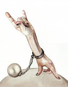 Die Aquarelle sind mit Sorgfalt gemalt und in ihren Aussagen mehrdeutig. Das bekannte Punkrockzeichen, die nach oben zu Hörnern gestreckten Kleiner- und Zeigefinger, wird an der nach unten gehaltenen Hand, am gleichen Arm, das Zeichen eines Fußballtores. Am Handgelenk eine Handschelle mit einer Kugel aus Stahl. Populäre Symbole der Freizeit oder reines Verderb.